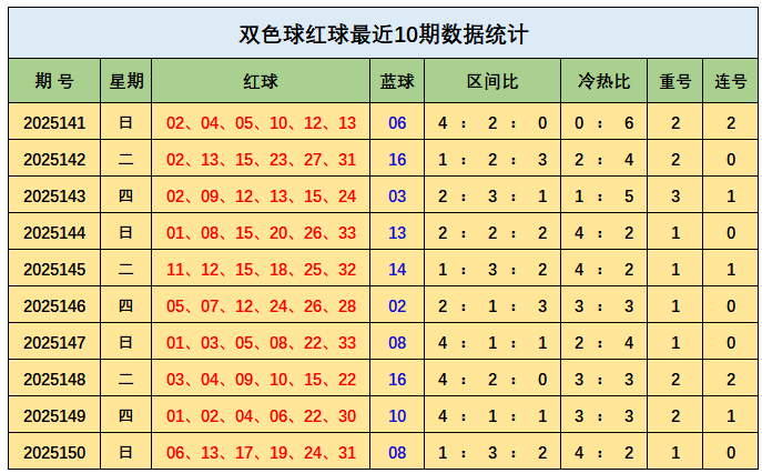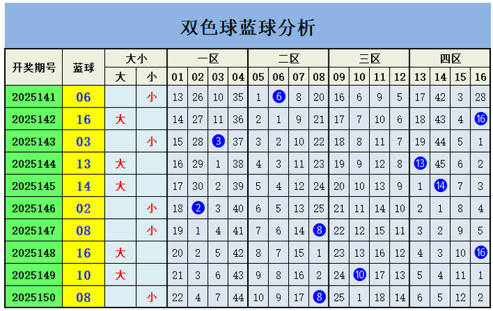 上期回顾:双色球第2025150期开出奖号:红球06、13、17、19、24、31;蓝球08,其中红球三区比为1:3:2,开出1枚重号06,开出0组连号,蓝球开出二区号码08。